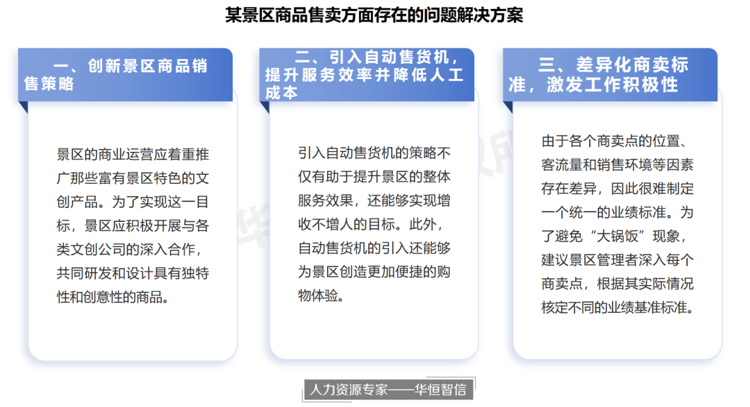 针对以上问题,景区管理者比较苦恼,如何更好地运用“景区+商业”模式,实现两者之间的优势互补,成为了摆在各个景区面前的一大挑战。经过景区管理层商讨后决定,邀请业内领先的人力资源专家——华恒智信的帮助。希望借助专业第三方的智慧和经验,对景区内部商卖进行管理提升,通过合理的改革建议,实现景区商卖的效益增加,同时也为游客提供多元化的服务。