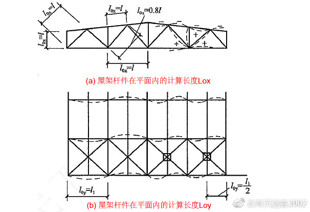 (1)屋架上弦杆的Loy:一般取上弦横向水平支承的节间长度,如图2(b)中,Loy=L₁。