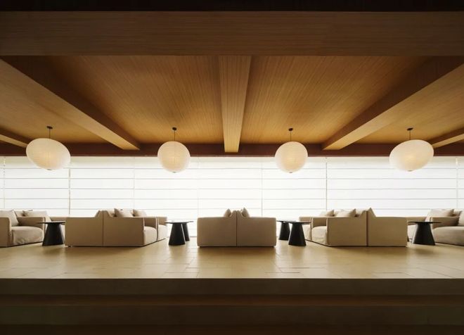 整个咖啡空间摒弃惯用的射灯,以自然灯光作补充照明,弱化商业气息,还原日升日落的光影流转,树影扶疏间建立人与自然的生动感知。空间用材以肌理感木材、粗粝的纺织品为核心,天然有机的元素平衡现代简洁硬朗的线条,饰以生机绿植和艺术品,使氛围丰盈灵动。