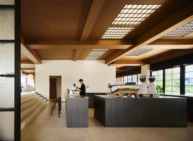 室内采取开放式的布局,大面积玻璃和法式落地窗格与室外景观交互联动,将一侧沙发客座区抬高,暗示区域过渡的同时增加空间的错落层次,此外,以咖啡操作台为中心,分散延伸出商务、聚会、阅读以及个人闲暇等功能区域,满足多元、乃至多重的消费需求,整体格局流动且舒缓。