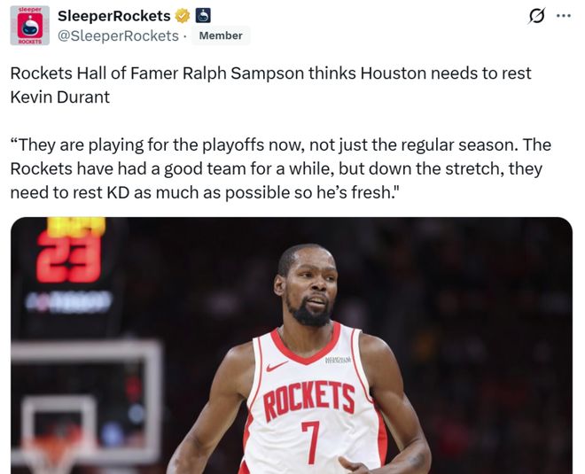 火箭名宿桑普森对此一针见血的点评道:“火箭该为季后赛而战,不要仅仅着眼于常规赛,他们必须尽可能让杜兰特获得更多休息时间,确保他以满血状态出战季后赛。”
