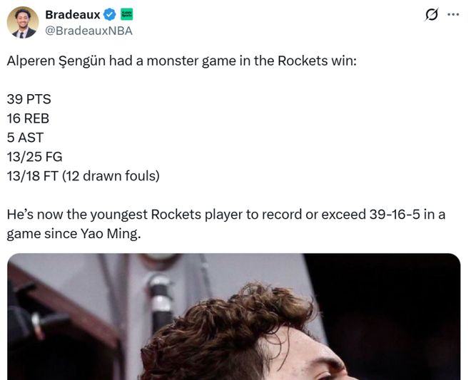 凭借这样的表现,23岁193天的申京成为姚明后,火箭队史单场至少拿下39分16板5助最年轻的球员。